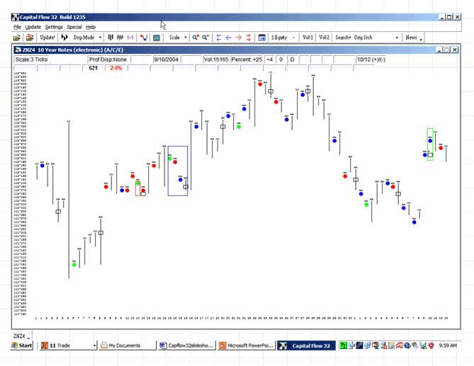 Capflow32 utilizes the Market Profile™ as the input medium and allows the user to ‘dial in’ the parameters for the patented algorithm to create a database which is representative of the timeframe the trader wants to trade.